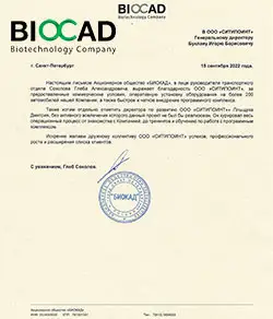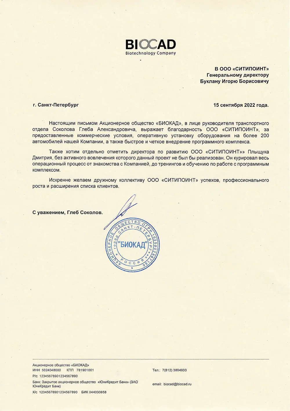 Настоящим письмом Акционерное общество «БИОКАД», в лице руководителя транспортного отдела Соколова Глеба Александровича, выражает благодарность ООО «СИТИПОИНТ», за предоставленные коммерческие условия, оперативную установку оборудования на более 200 автомобилей нашей Компании, а также быстрое и четкое внедрение программного комплекса.