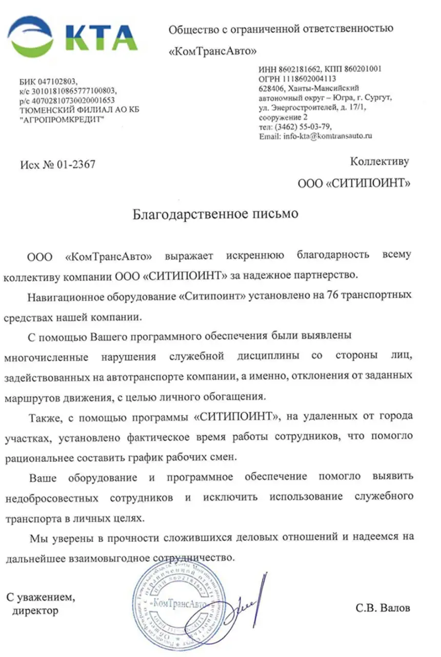За время совместной работы СитиПоинт и ООО “КомТрансАвто” нам удалось реализовать полный контроль использования автопарка и обеспечить повышение рабочей дисциплины сотрудников.