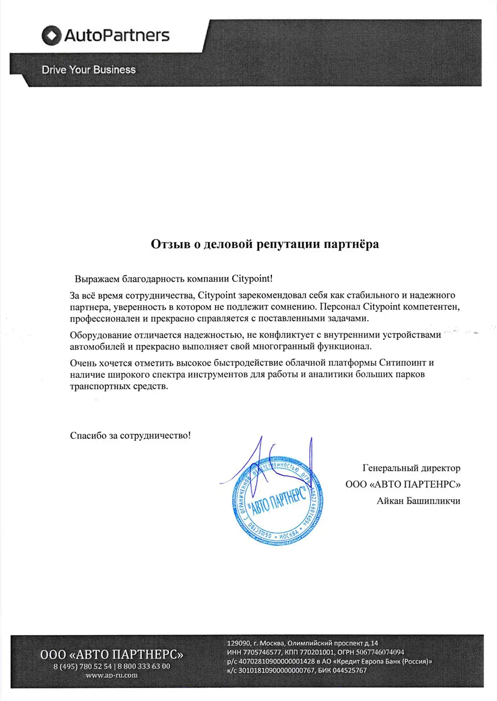 В целях обеспечения клиентам высокого качества обслуживания в сфере мониторинга транспорта, компания «АВТО ПАРТНЕРС» устанавливает на автомобили оборудование СитиПоинт.