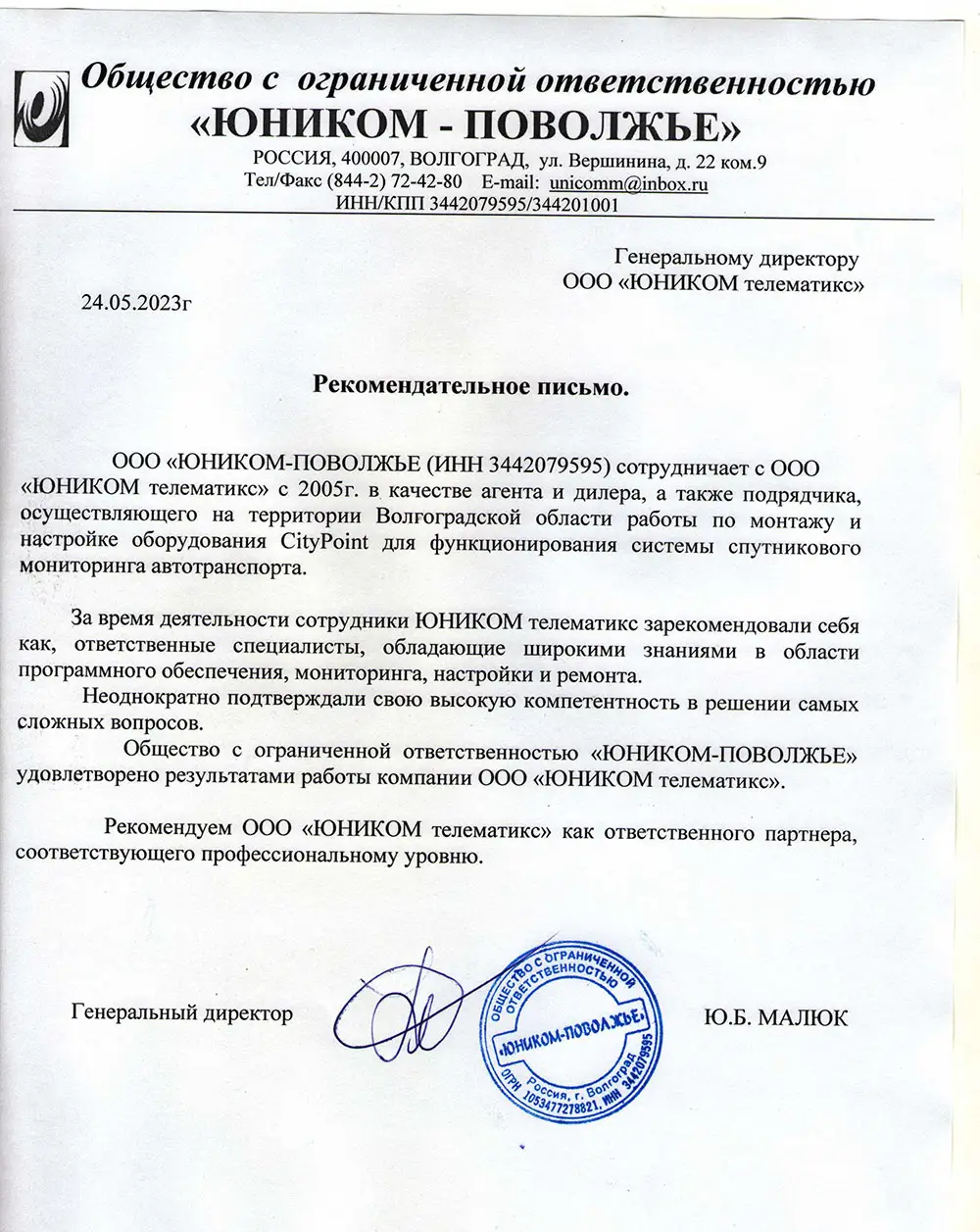 Компания ООО «Юником-Поволжье» создана в 2005 году в г. Волгограде. Основным направлением деятельности является поставка и организация профессиональной радиосвязи, а также предоставление услуг мониторинга автотранспортных средств СитиПоинт.