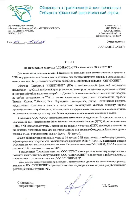Навигационным комплексом СИТИПОИНТ оборудовано 504 единицы техники, в том числе специализированной. Для контроля топлива всего установлено 524 датчика уровня топлива и CAN считывателя данных. Анализ данных за 10 месяцев 2019 года показал экономию ГСМ АИ-92, АИ-95 на 10%, дизельного топлива - 20%.