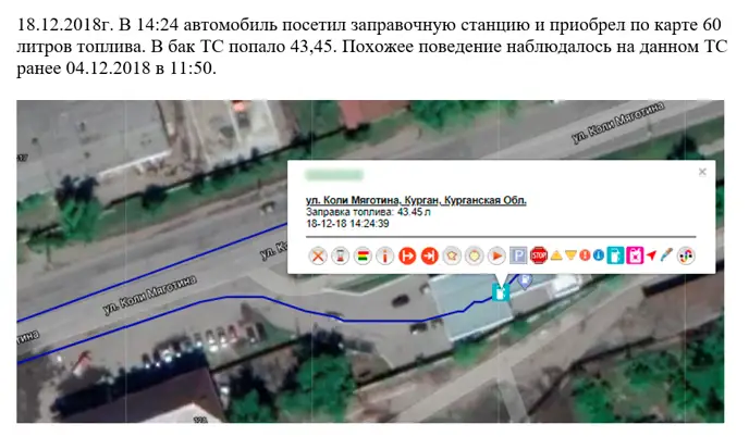 - Контроль нахождения ТС на АЗС на момент заправки: возможность перехода в карту при клике на адрес, где зафиксирована заправка или слив