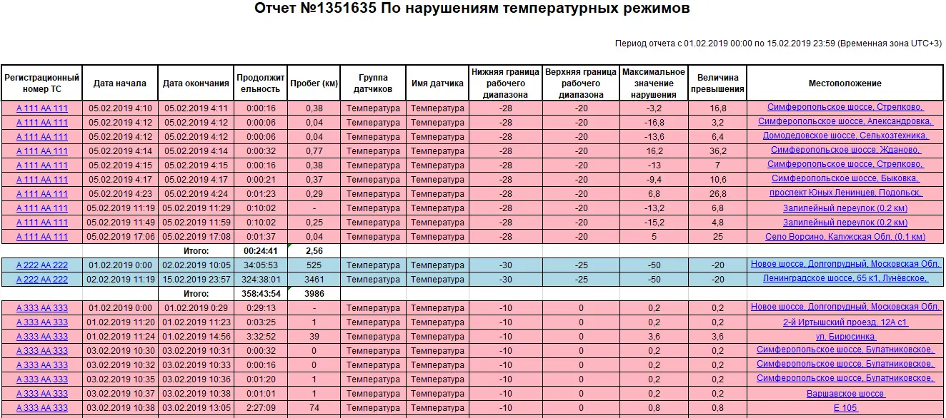 Недопустимые колебания температуры в холодильной установке на протяжении всего пути фиксируются в специальном в отчёте. В отчёте собраны данные по количеству, длительности и месту нарушений. Отклонения по верхней и нижней границам температурной нормы выделяются дополнительным цветом.