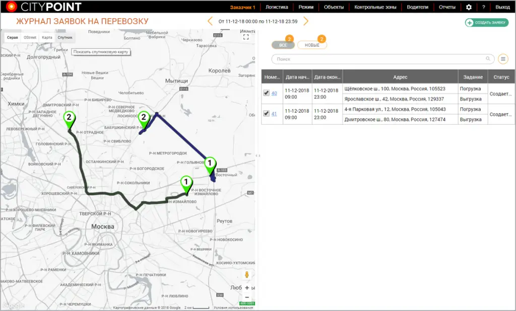 Создание заявок на перевозку