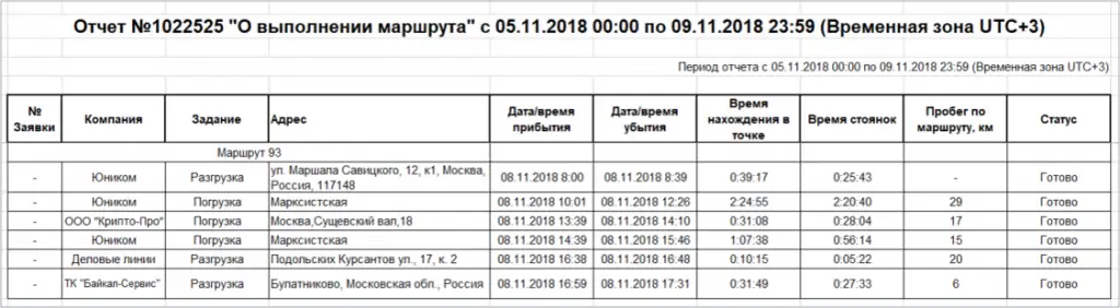 Ход исполнения маршрутных заданий отображается на карте и в сводной таблице интерфейса "Контроль маршрутов". Цветом выделяются возможные задержки, фактические опоздания, выполненные и плановые задания. Для своевременного контроля план-факта исполнений заданий сформируйте отчёт "О выполнении маршрута" за нужный период.