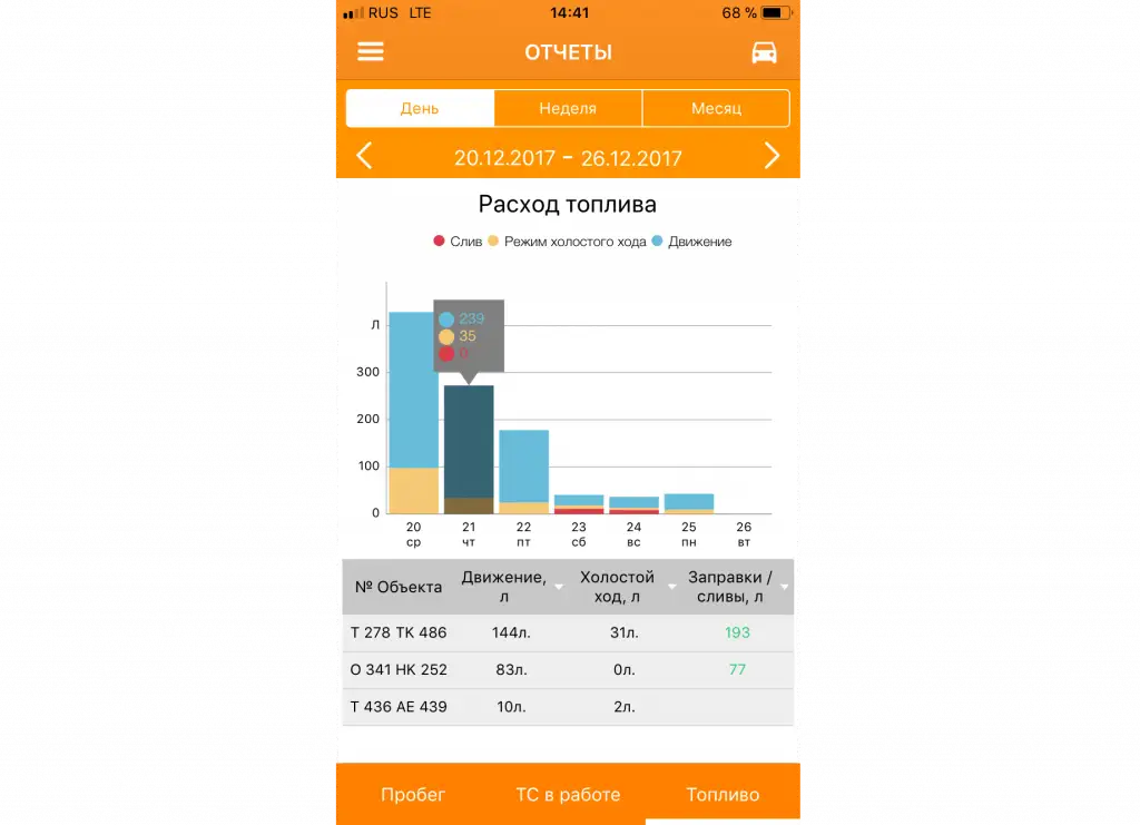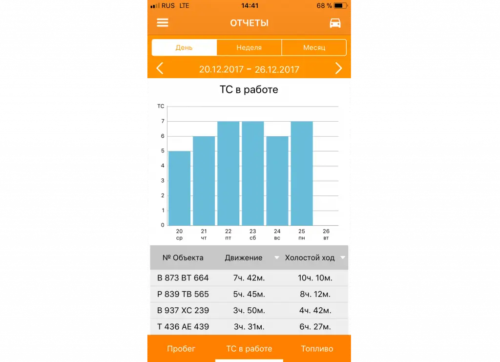 - контроль целевых показателей работы автопарка за день/неделю/месяц: